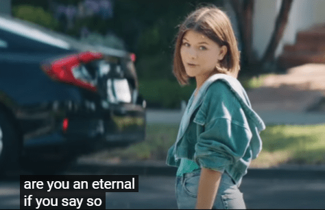 But then Sprite, aka Lia McHugh herself, walks by, walking a dog, apparently a resident of this suburban bucolic neighborhood (PS I wonder if she has adopted parents – or does she own a home now? Does she still go by Sprite? Does she have a regular name or do people in 2021 think “Sprite” is just an ok regular name. If I ever have a daughter maybe I would name her Sprite… anyway) and the child asks Sprike aka Lia directly if she is an “Eternal”. Lia answers as Sprite, “If you say so”.