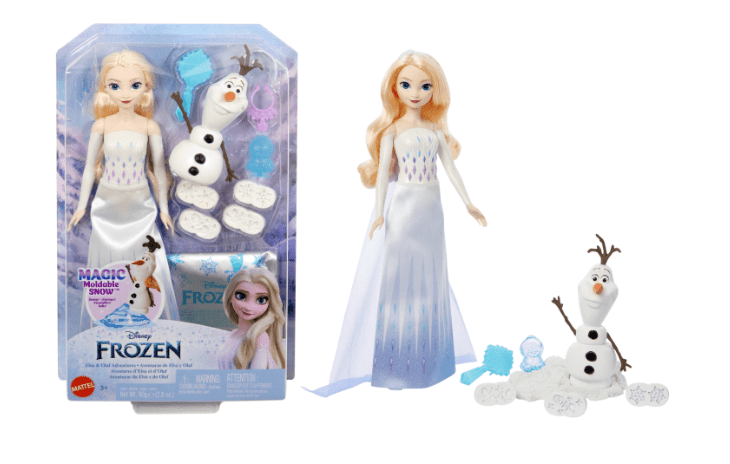 I really hope this signals that a doll redesign might be in the works for sometime in 2024 with this reworked packaging. At Target yesterday, I did notice a new Elsa from FROZEN doll was available for the first time in a while. After looking into it, it looks like it was officially released on the Mattel website last month in July 2024 – around the same time that the new Princess packaging arrived. It came with moldable snow and Olaf. See picture below: