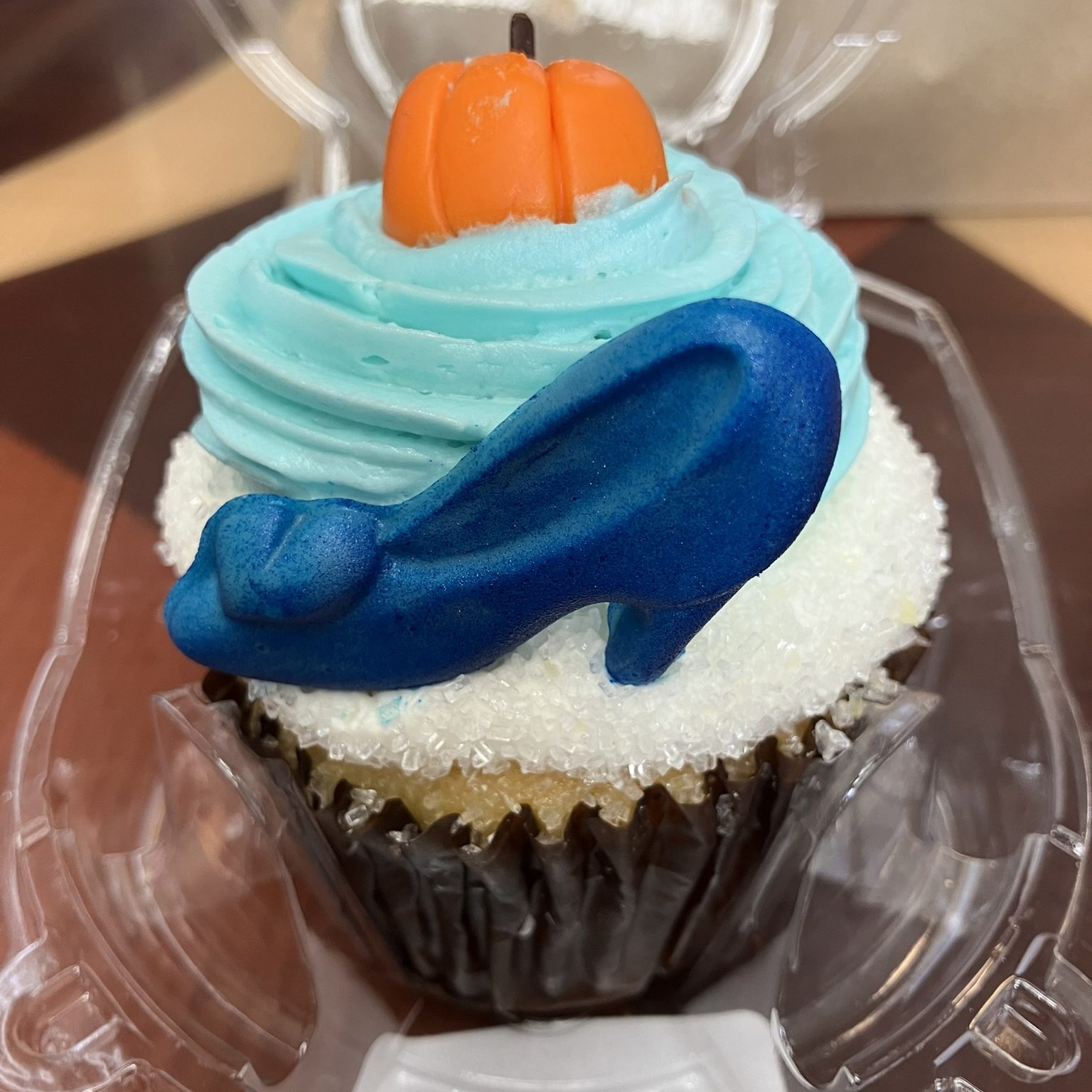 The cupcake is described by Disney Parks Blog as “vanilla cake with vanilla crème custard filling, buttercream, white chocolate slipper, and fondant pumpkin.” It is sold for $6.99.