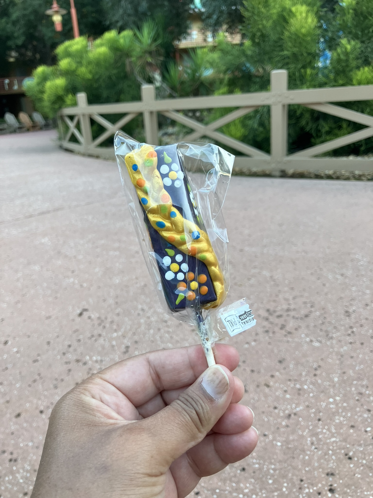 The Ganachery was offering a Rapunzel version of one of its famous “Ganache” pops. A Ganache pop is essentially a chocolate bar on a stick – or a chocolate lollipop, usually themed and decorated to make it a confection far beyond my pale description. This was the fourth treat of the afternoon and by the time I consume it, we were heading into the evening. Luckily, I was able to refrigerate it for a bit and cool it down. The Parks Blog describes this treat as “dark chocolate, vanilla beans, and candied cherries covered in 65% dark chocolate.”