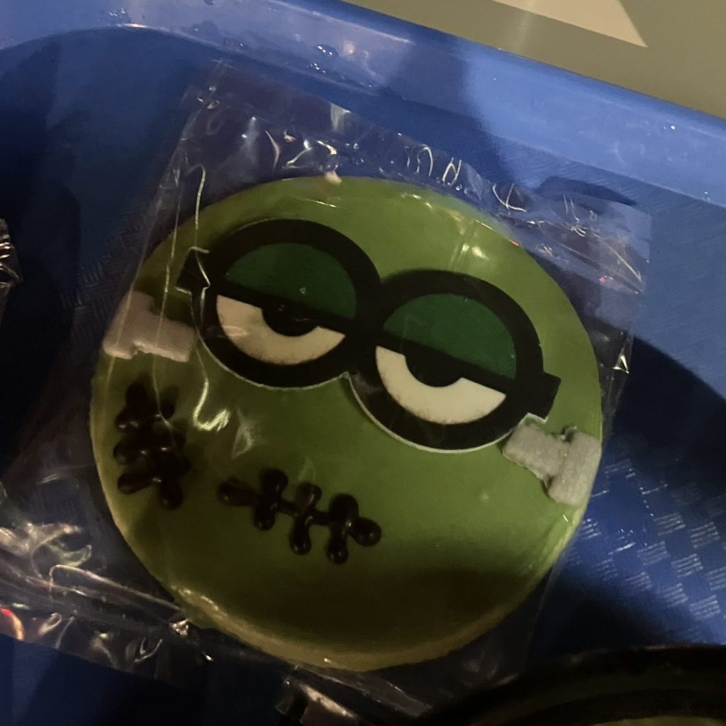 The Monster Minion Cafe itself is basically the normal minion cafe with spooky minion projections added along with some fun but spooky music. It is actually a quiet corner of HHN (at least on my first night) which made it easy to both order, get food and find a seat. The team members there were happy to serve up the featured items – and frankly I was a little nervous to order the Monster Bob punch. It was not on the sign – though it is listed in the app. But the team member was happy and welcoming and knew exactly what I wanted and she served it up quickly. Monster Minion Cafe is the perfect place to get a rest, some food, and a recharge before heading out to more HHN houses and scare zones in the night. Now, to the food.