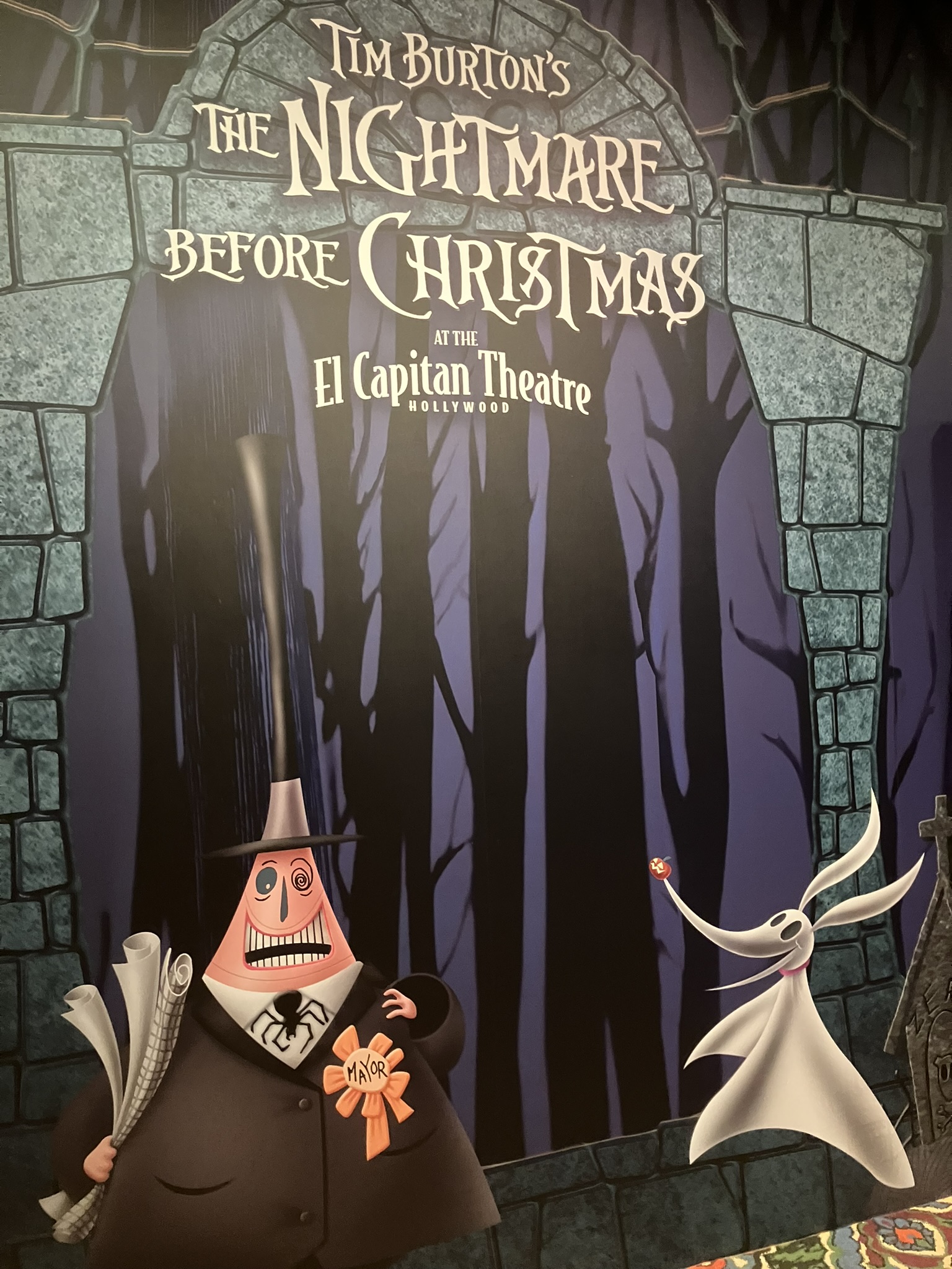 I’ve seen so many films at the El Capitan over the years, including SOLO and recently ETERNALS, which I profiled previously and you can read if you CLICK HERE. And I am old enough to remember seeing Tim Burton’s NIGHTMARE BEFORE CHRISTMAS in theaters as a kid. So when the El Capitan Theatre offered a repertory screening of the now classic NIGHTMARE BEFORE CHRISTMAS and I was in LA, I decided it was a must do.