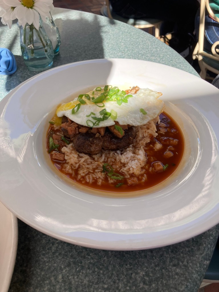 The first dish is “Hamburger Steak and Eggs”, described on the Disneyland website as “[hamburger steak and eggs] with Spiced Ham, White Rice and Mushroom Gravy”. Aka a genuine Loco Moco – being served right at River Belle Terrace. Per Wikipedia, “The traditional loco moco consists of white rice, topped with a hamburger patty and brown gravy, and finally a sunny-side up fried egg. These ingredients must exist in the dish to be named loco moco. No other egg variations are considered traditional and the stacking of the dish must be in the aforementioned order to be considered traditional”