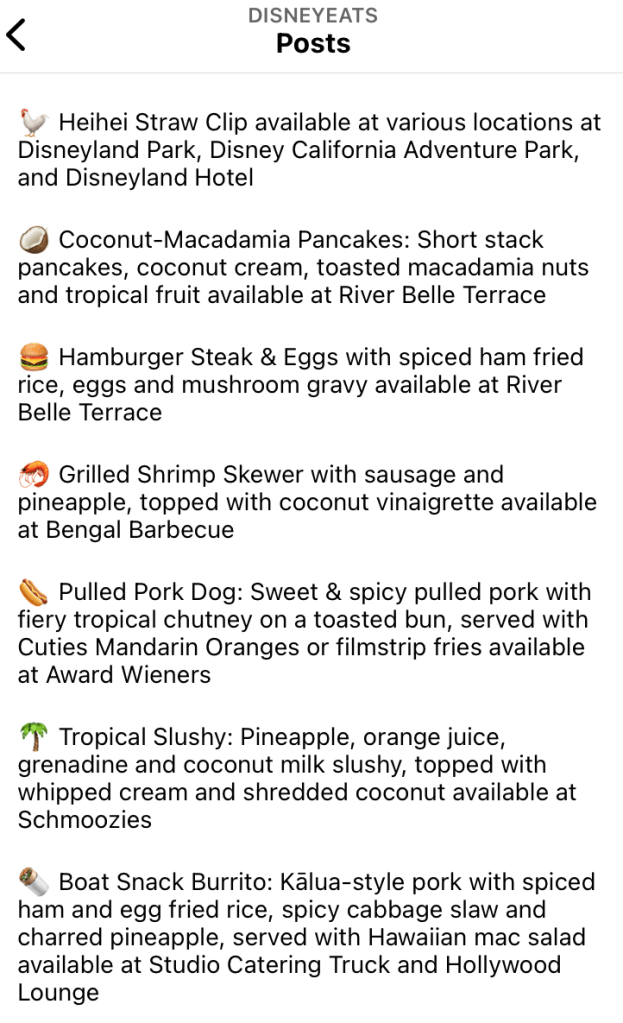 Overall, I say make the trip to River Belle Terrace for the Loco Moco – I mean Hamburger Steak and Eggs – and also DO NOT MISS that Tropical Slushy at Smoothies. The Wayfinder dog is good but I’m not sure if it will float your boat – pun intended. And the coconut macadamia pancakes – maybe just try the regular short stack instead. Still, none of these dishes were awful and each had their own varying degree of success. I love I couldn’t eat EVERYTHING in one trip, so I will be trying a few more of the remaining items in the next week. So stay tuned for part 2 of this series as I make the trip back to Disneyland to try the shrimp skewer at Bengal BBQ at Disneyland and the Boat Snack Burrito at Studio Catering Company.