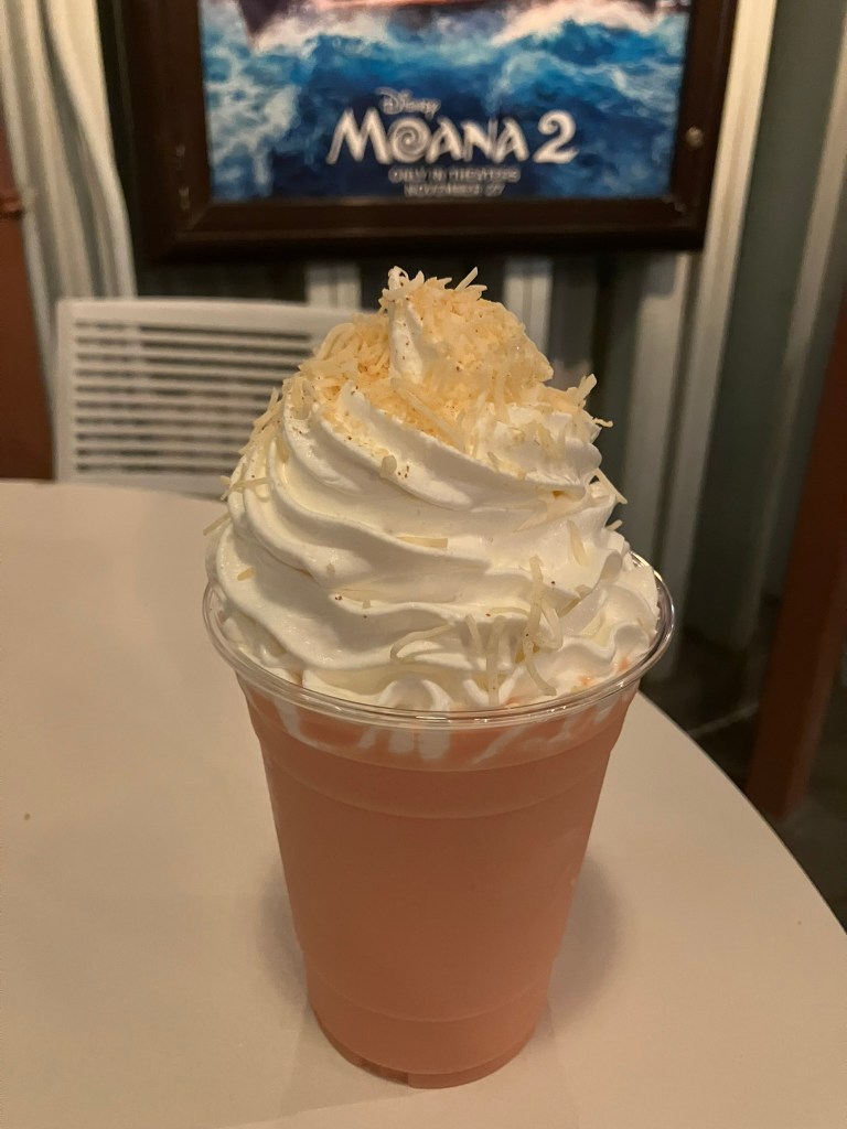 Last up for the day was the Tropical Slushy at Schmoozie’s at DCA. The slushy is described on the website as “Pineapple, Orange Juice, Grenadine and Coconut Milk Slushy, topped with Whipped Cream and Shredded Coconut”. I thought this beverage was ABSOLUTELY delicious. Every flavor comes together with just the right amount of coconut milk adding a bit of texture. The topping is also so delicious. I basically ate it as a side treat – with a spoon. I also visually love the orange color which to me, represents some of the color profile of Moana as a character and princess, especially with her new outfit in MOANA 2. I will 100% be getting this one again when I go back to the parks as it is the perfect strolling beverage. This is a 5 out of 5 for me but if I could give it 6, I would. This was THE ITEM OF THE DAY!