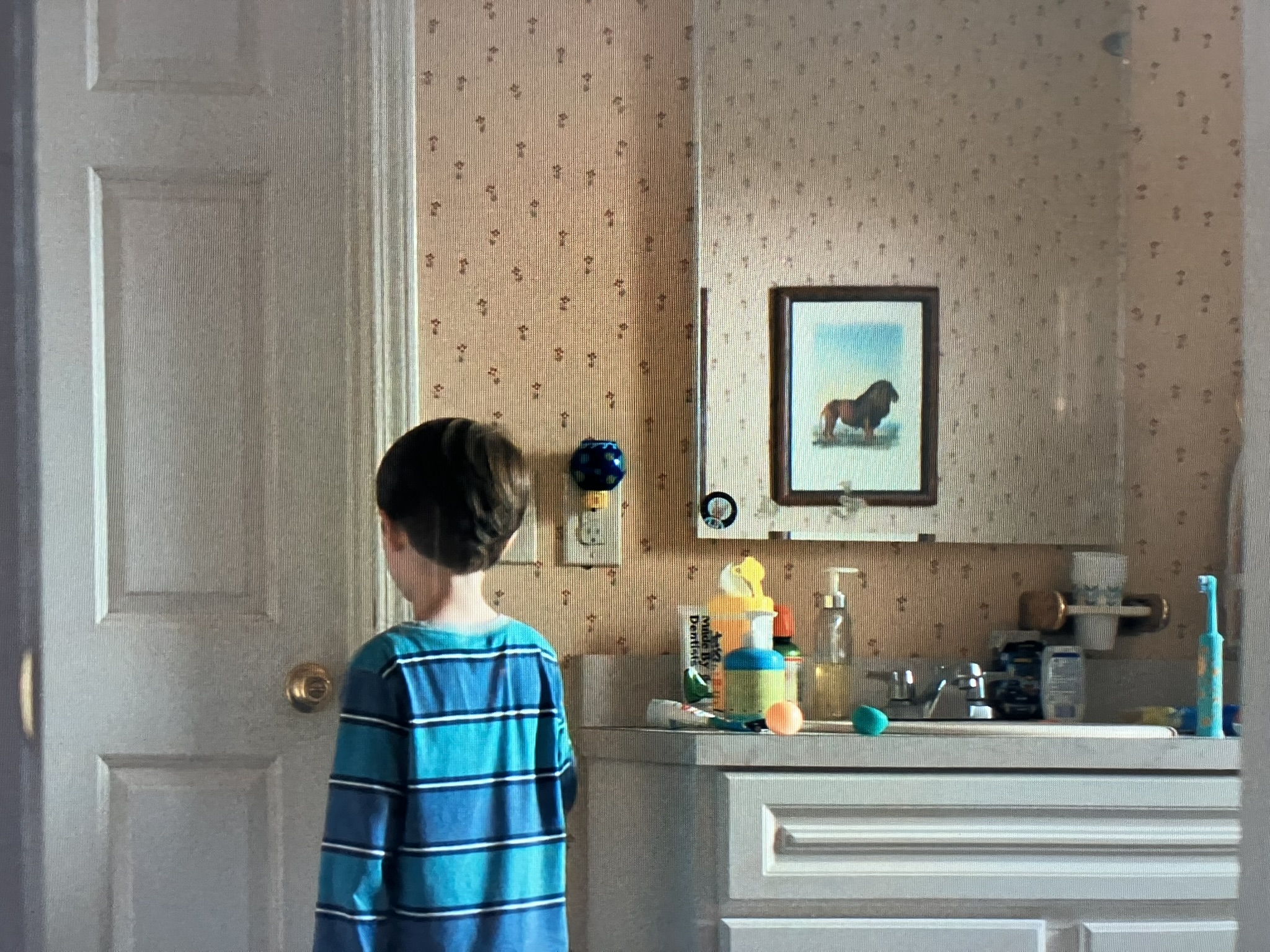 Later on as Alex’s chapter of the film begins we hear Justine speaking to the class about parasites and parasite classifications are seen on the whiteboard behind her – a fairly obvious but not inconsequential moment. Later on in this chapter, subtle but just as important visual cues highlight the predatory nature of Alex. First, it is notable that Alex is constantly seen wearing a shark backpack – an apex predator of the sea. Second, when Alex is brushing his teeth and he steps down from the stool at the sink, the audience sees that Alex’s head is hiding a picture of a lion, another apex predator.
