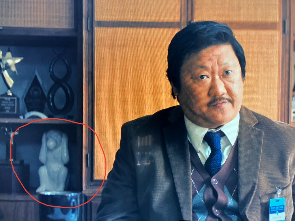 You can see a version of the “speak no evil” monkey here behind Captain Ed, Toby Huss, when he is speaking with Archer. Here Ed talks Archer down from believing that something is wrong or suspicious about Justine Gandy, the teacher of the disappeared class of students. Ed believes that Justine is totally trustworthy, and while she is essentially, it speaks to a greater malaise that Ed is not willing to really think outside the box, again, when dealing with the disappearing students. We later discover that the police actually interviewed Aunt Gladys and Alex Lily and even visited the Lily home with Aunt Gladys and Lily inside after the abduction and never felt like something was “wrong” and will now go to the mat to defend that opinion through their words and interaction with the general public.
